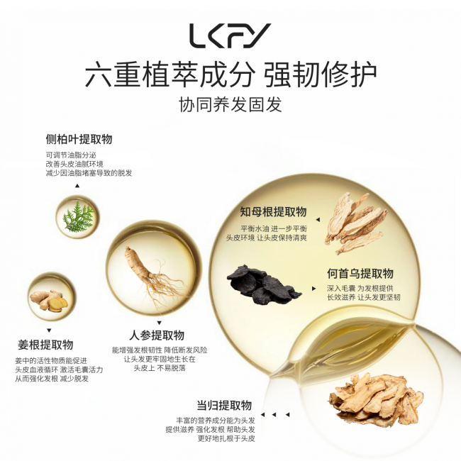 针对毛囊萎缩、发根营养匮乏导致的发根松动、易断问题,产品引入何首乌、人参、当归三重植萃成分协同作用,构建“激活-滋养-固根”的支撑体系。何首乌能有效激活头皮微循环,实测可提升毛囊血流量42%,延长毛囊生长期30%以上,其活性成分可穿透头皮表层,直达毛囊深处,激活毛囊干细胞活性,从根本上改善毛囊萎缩问题;人参与当归则为毛囊补充氨基酸、维生素、矿物质等多种营养物质,实测可提升发根坚韧度58%,从根源解决毛囊营养匮乏问题,让发根支撑力显著增强,减少掉发。