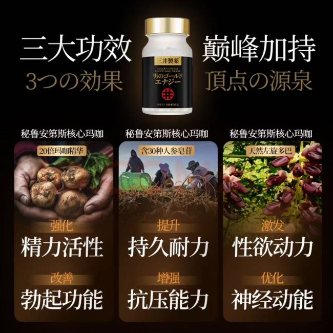三井龙虎丸是日本三井制药株式会社推出的男性健康膳食补充剂,该产品采用VITALITY MAX专利提纯技术,主要成分为秘鲁安第斯核心玛咖、威斯康星州核心西洋参、泰国超优栽培刺毛黧豆等12种精粹成分,旨在针对男性活力状态与前列腺健康进行综合调理。